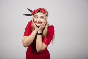 Young beautiful woman in red mask holding her face